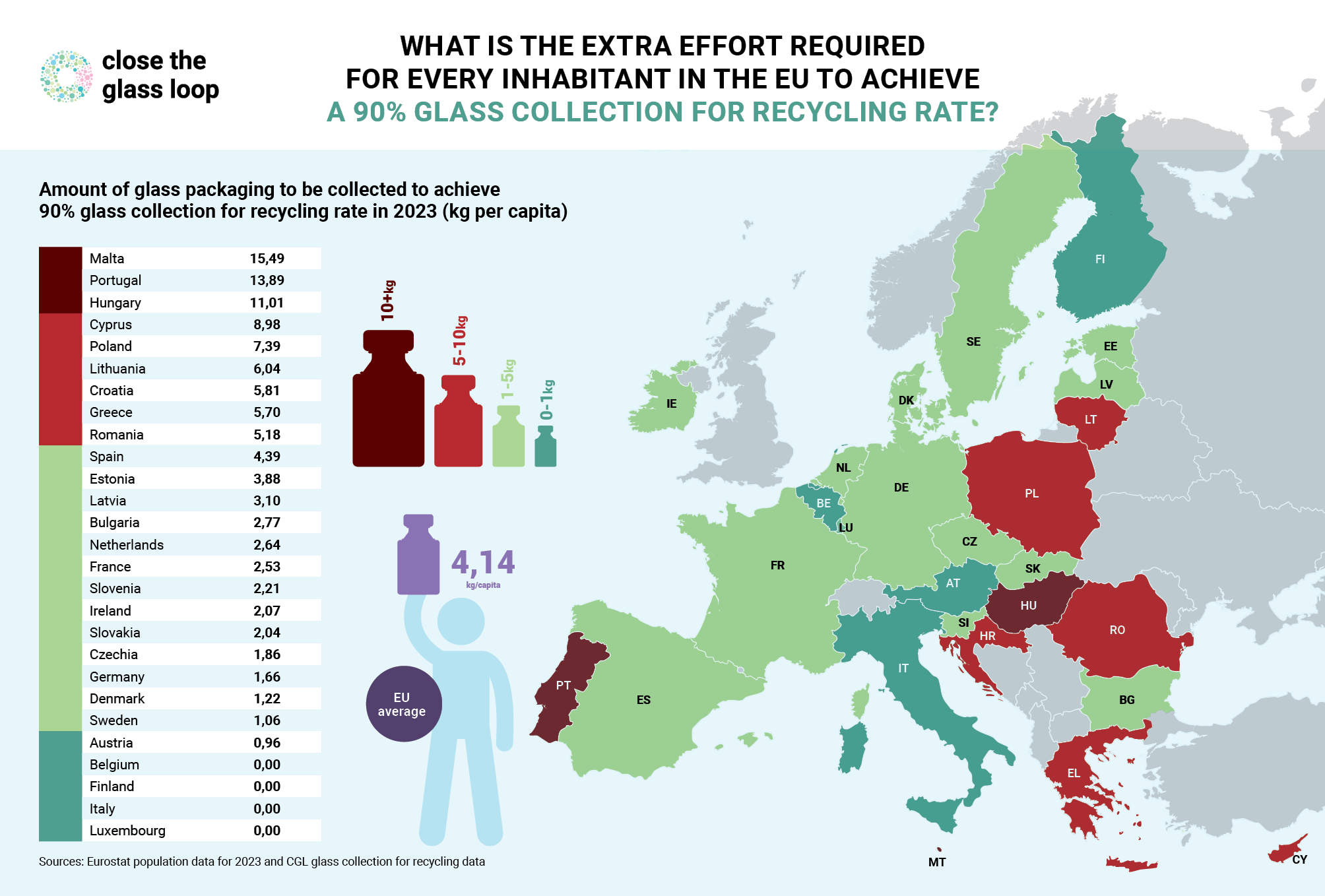 🔹 Across the European Union, each citizen would need to collect an additional 4.14 kilograms of glass packaging to reach the 90% collection for recycling target.